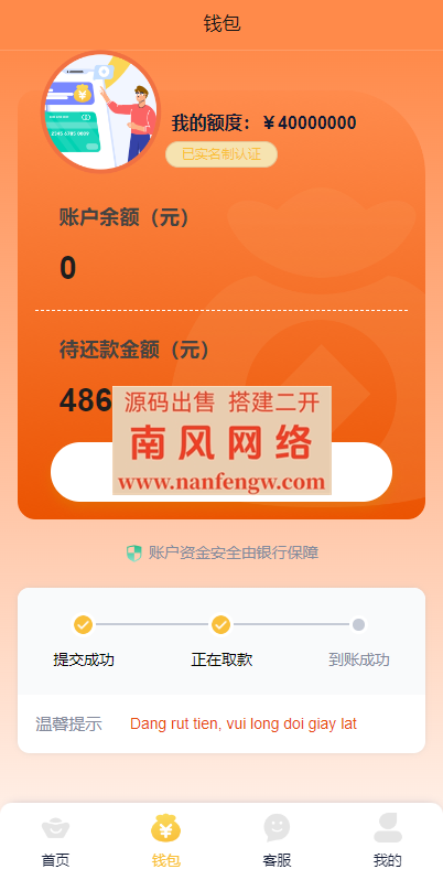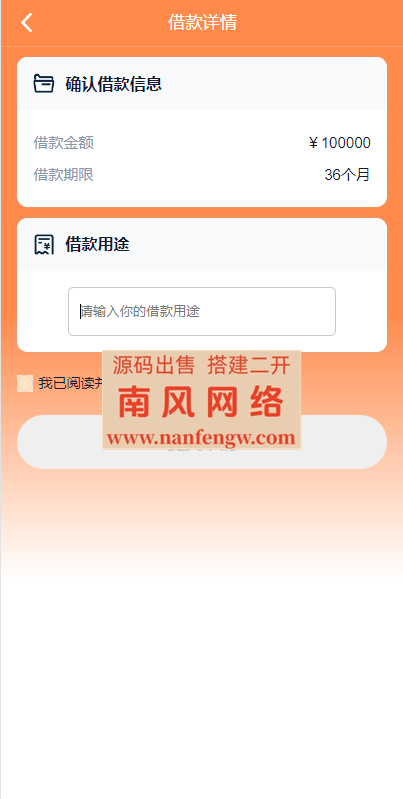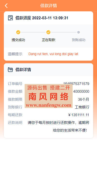 当前位置:南风网络-精品海外源码网 精品资源 vue版贷款系统/海外贷款源码/小额贷款源码 vue版贷款系统/海外贷款源码/小额贷款源码一套比较经典的贷款源码, 后台 代理 前端均为vue源码,前端有中文和越南语前端ui黄色大气,逻辑操作简单,注册可对接国际短信,可不对接用户注册进去填写资料,后台审批,审批状态可自定义修改文字显示免责声明:1.本站提供的一切源码、教程和内容信息仅限用于学习和研究目的;不得将上述内容用于商业或者非法用途! 2.本站信息来自网络收集整理,版权争议与本站无关。您必须在下载后的24个小时之内,从您的电脑或手机中彻底删除上述内容! 3.本站提供的源码,模板,插件等其他资源都不包含技术服务,敬请谅解! 4.本站资源售价只是赞助,收取费用仅维持本站日常运营所需! 5.本站不保证所提供下载的资源准确性安全性和完整性,源码仅供下载学习之用! 6.如用于商业或者非法用途,与本站无关。一切后果请自行负责! 贷超系统 贷款超市 贷款 南风网络-精品海外资源网内容投诉南风网络-精品海外源码网 » vue版贷款系统/海外贷款源码/小额贷款源码