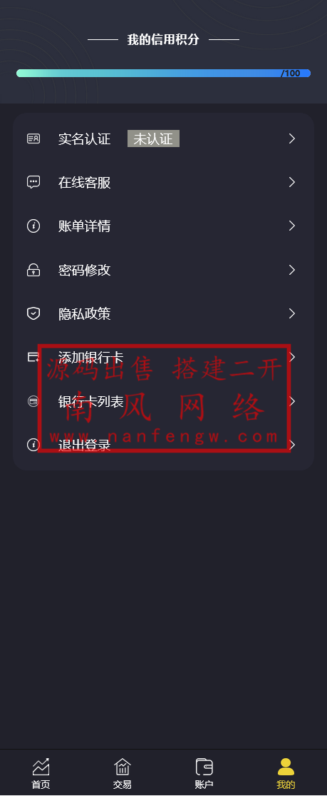 当前位置:南风网络-精品海外源码网 精品资源 uniapp开发微盘微交易系统二 多语言交易所系统/合约/秒合约/微盘/微交易 uniapp开发微盘微交易系统二免责声明:1.本站提供的一切源码、教程和内容信息仅限用于学习和研究目的;不得将上述内容用于商业或者非法用途! 2.本站信息来自网络收集整理,版权争议与本站无关。您必须在下载后的24个小时之内,从您的电脑或手机中彻底删除上述内容! 3.本站提供的源码,模板,插件等其他资源都不包含技术服务,敬请谅解! 4.本站资源售价只是赞助,收取费用仅维持本站日常运营所需! 5.本站不保证所提供下载的资源准确性安全性和完整性,源码仅供下载学习之用! 6.如用于商业或者非法用途,与本站无关。一切后果请自行负责! 交易所 微交易 南风网络-精品海外资源网内容投诉南风网络-精品海外源码网 » uniapp开发微盘微交易系统二